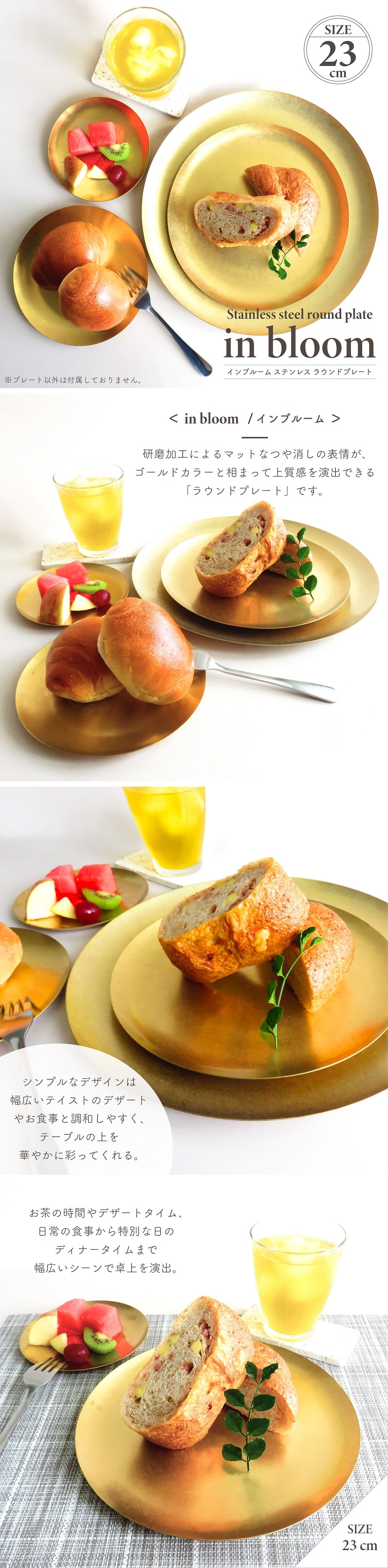食器 プレート インブルーム ステンレスラウンドプレート23cm ステンレス製 真鍮風 ゴールド仕上げ 食洗機使用可 ランチ 軽食 ヴィンテージ・アンティーク調