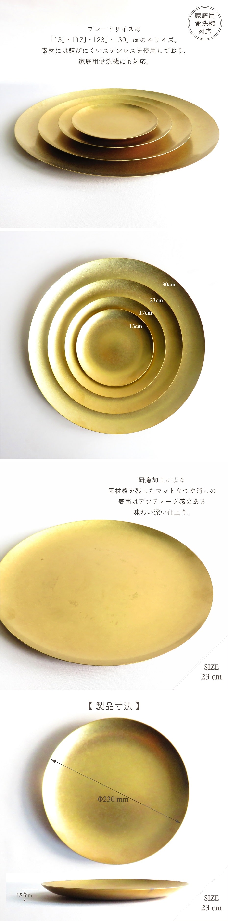 プレートサイズは13・17・23・30cmの4サイズ。素材には錆びにくいステンレスを使用しており、家庭用食洗機にも対応。中型サイズの「23cm」サイズのプレートはランチや軽食などの軽い料理をワンプレートでまとめるのもおすすめ。