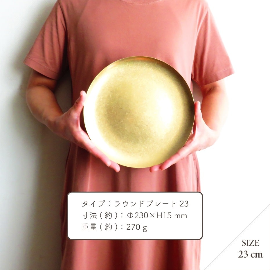 研磨加工によるマットなつや消しの表情が、ゴールドカラーと相まって上質感を演出してくれる「23cmサイズ」のラウンドプレートです。シンプルなデザインは幅広いテイストのデザートやお食事と調和しやすく、テーブルの上を華やかに彩ってくれる。お茶の時間やデザートタイム、日常の食事から特別な日のディナータイムまで幅広いシーンで卓上を演出。