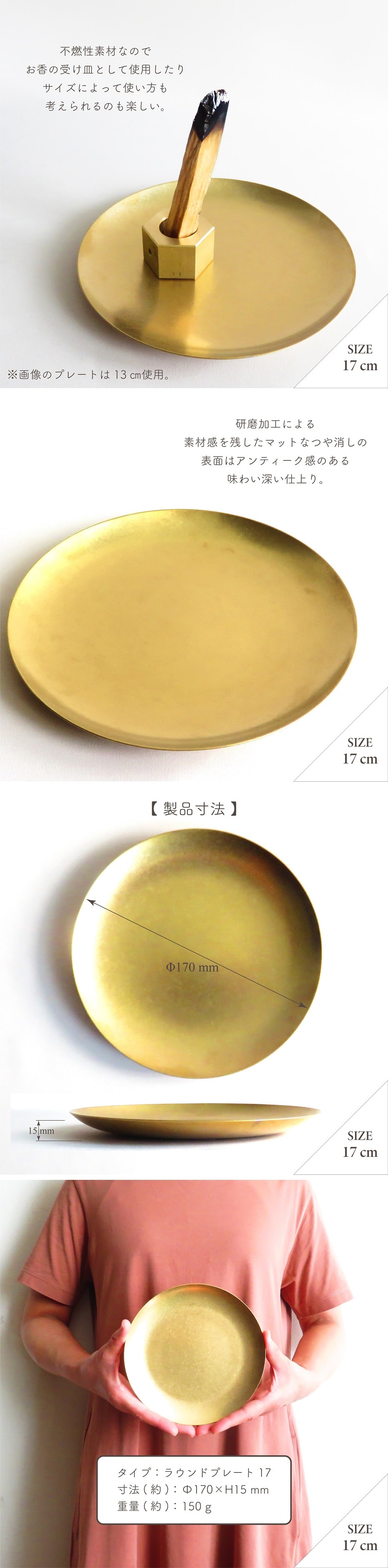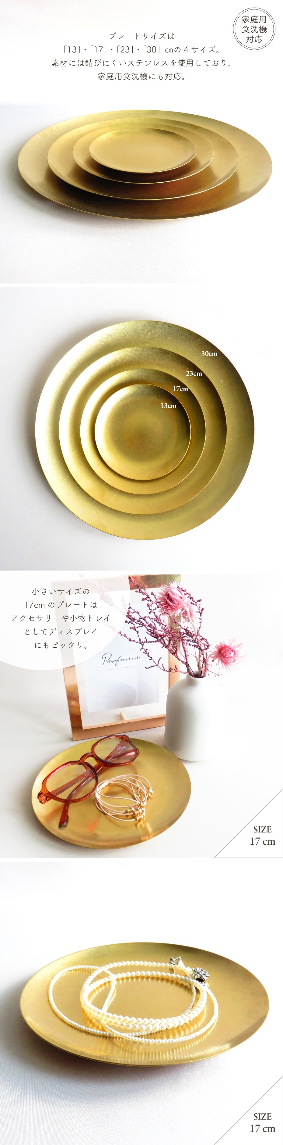 プレートサイズは13・17・23・30cmの4サイズ。素材には錆びにくいステンレスを使用しており、家庭用食洗機にも対応。小さいサイズの17cmのプレートはアクセサリーや小物トレイとしてディスプレイにもピッタリ。不燃性素材なのでお香の受け皿として使用したり、サイズによって使い方も様々なのも楽しい。