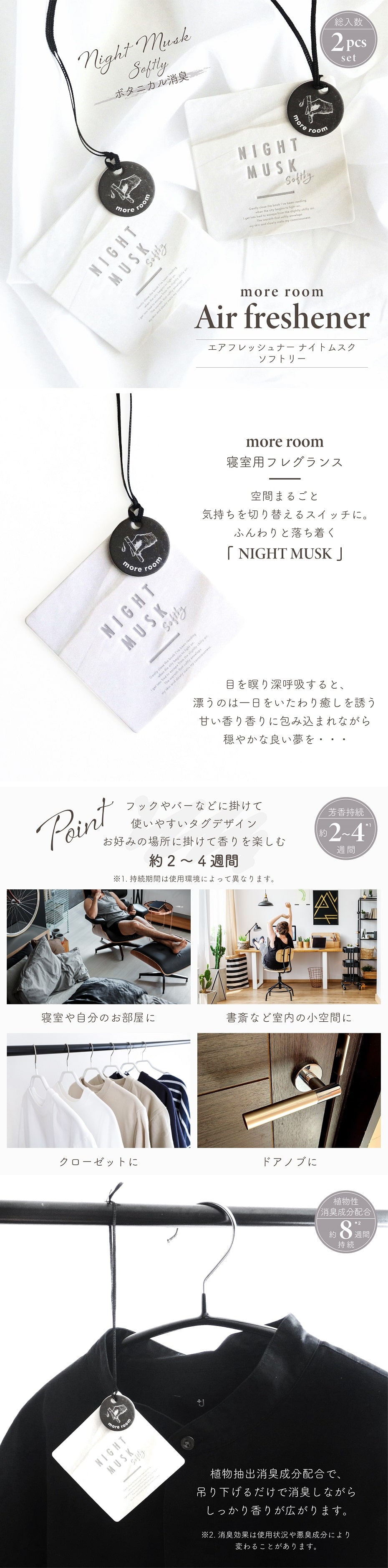 空間まるごと気持ちを切り替えるスイッチにふんわりと落ち着く寝室用フレグランス『NIGHT MUSK』シリーズから植物抽出消臭成分配合、吊り下げるだけで、 消臭しながらしっかり香りが広がる「エアーフレッシュナー」が登場。