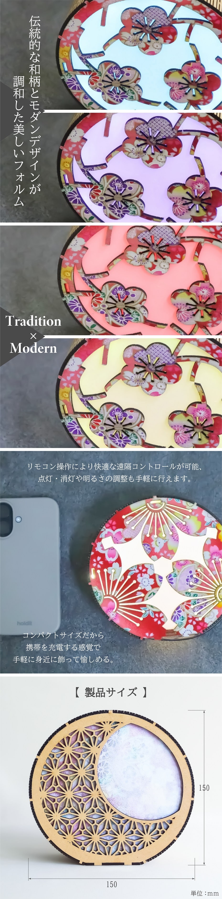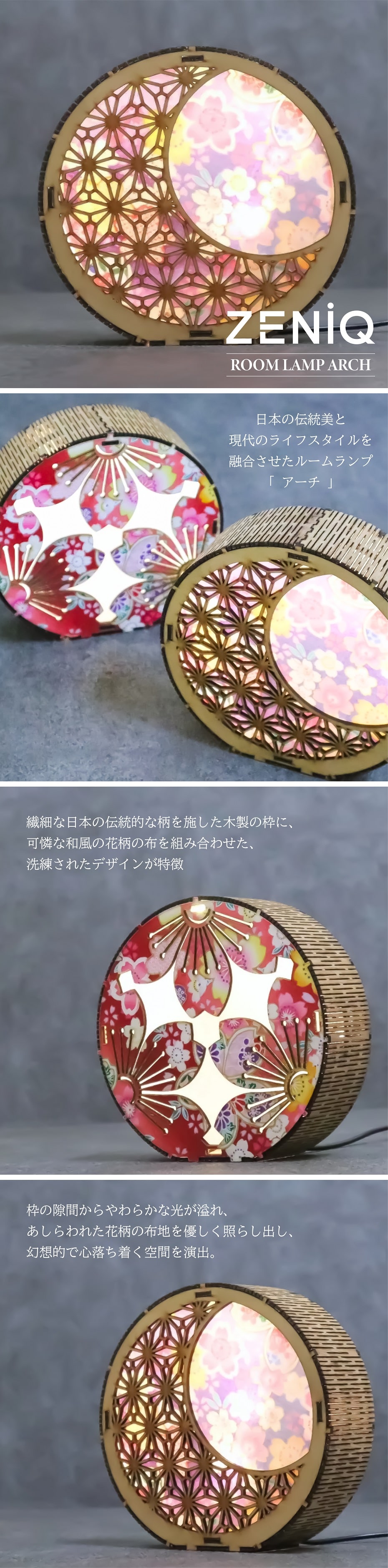 日本の伝統美と現代のライフスタイルを融合させたルームランプ「アーチ」。繊細な日本の伝統的な柄を施した木製の枠に、可憐な和風の花柄の布を組み合わせた、洗練されたデザインが特徴。