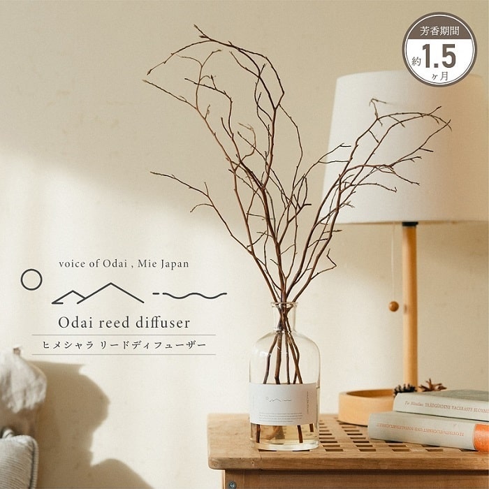 三重県南部の紀伊半島、大台町で誕生したブランド「Odai」。豊かな自然から生み出されたヒメシャラの枝の自然なシルエットが魅力のリードディフューザーセット。