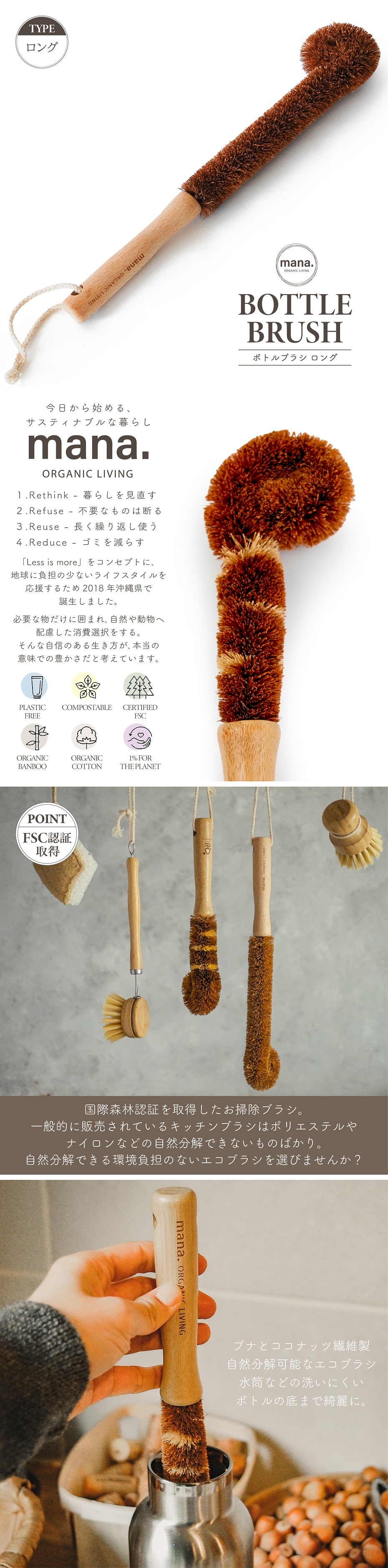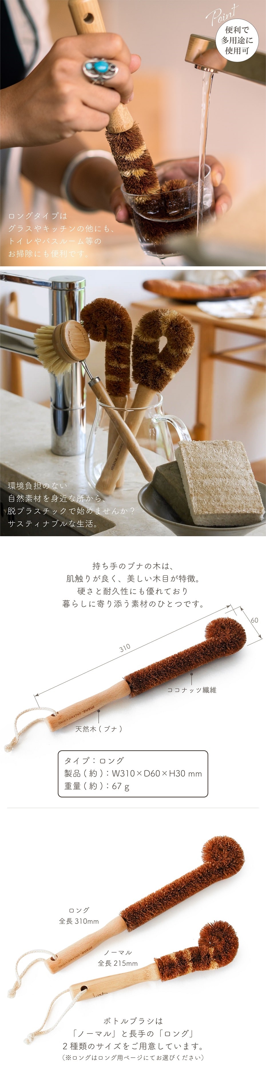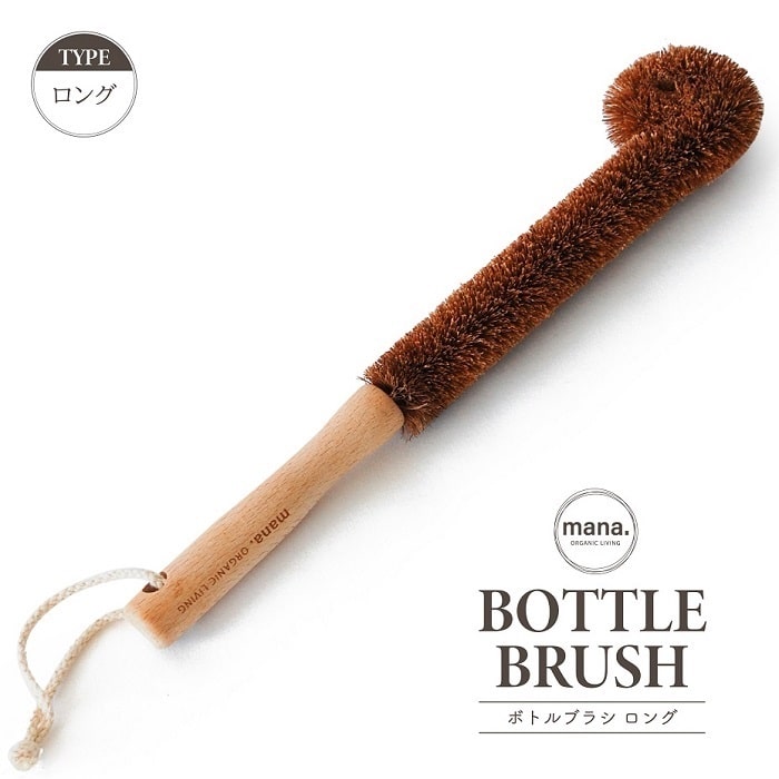 キッチンブラシ mana. ボトルブラシ ロング 全長31cm ブナ・ココナッツ繊維製 水筒 グラス 掃除ブラシ 自然素材 国際森林認証 柄付ブラシ 柄付たわし 掃除用品