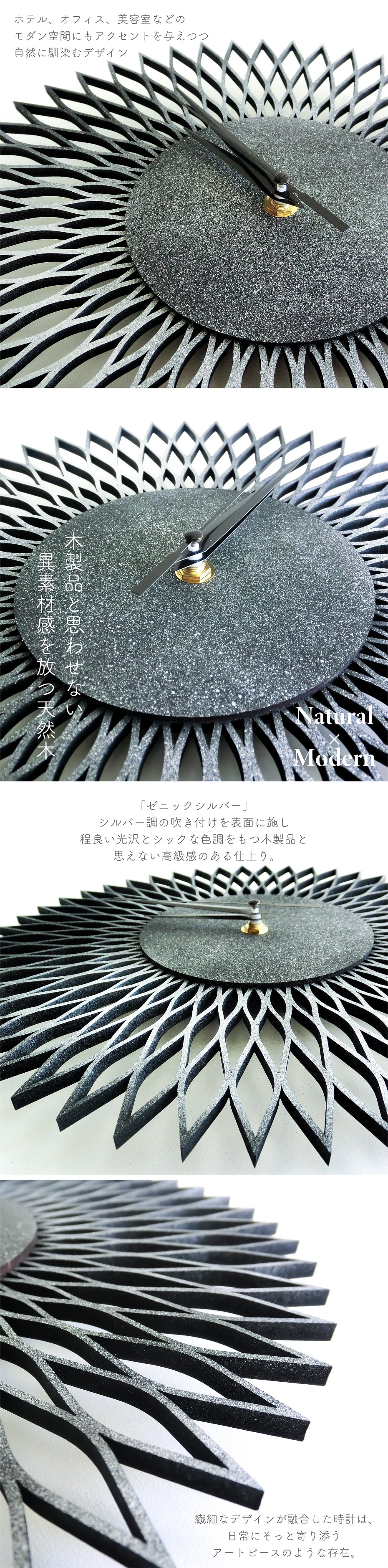 「ORBIT/オービット」は放射状に連続した模様が生み出す蓮の花を想わせるような造形は美しい陰影をつくる。木製品とは思わせない異素材感を放つ天然木、オリジナルカラーの「ゼニックシルバー」はブラックにシルバー調の吹付を表面に施し、程良い光沢とシックな色調をもつ木製品とは思えない高級感のある仕上り。繊細なデザインが融合した時計は日常に寄り添うアートピースのような存在。