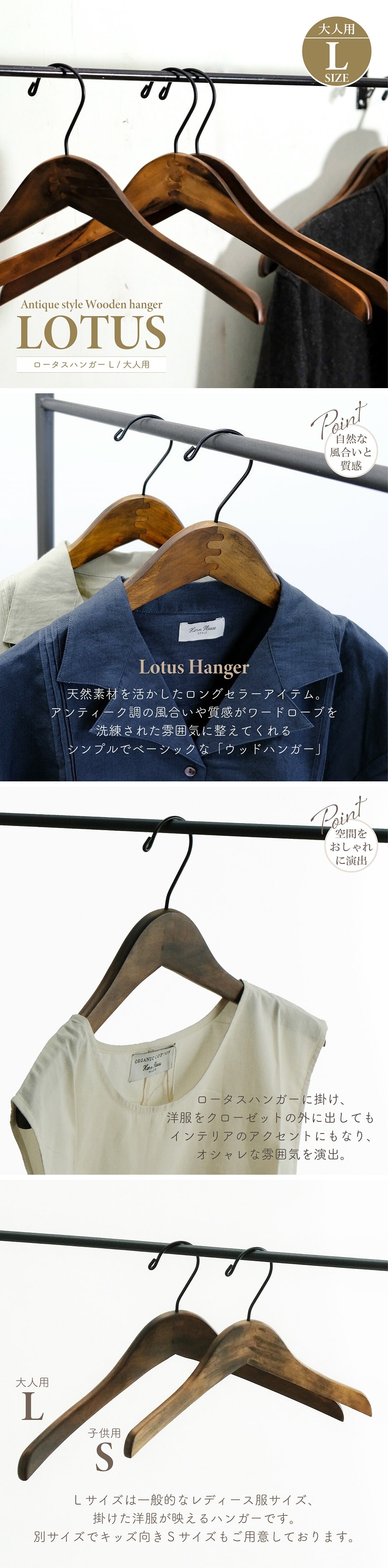 天然素材を活かしたロングセラーアイテム。アンティーク調の風合いや質感がワードローブを洗練された雰囲気に整えてくれる、シンプルでベーシックなウッドハンガーです。ロータスハンガーに掛け、洋服をクローゼットの外に出してもインテリアのアクセントにもなり、オシャレな雰囲気を演出。