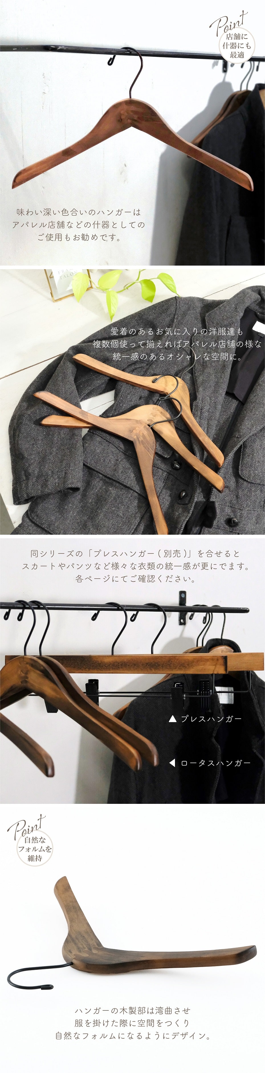 味わい深い色合いのハンガーはアパレル店舗などの什器としてのご使用もおすすめです。愛着あるお気に入りの洋服達も複数個使って揃えればアパレル店舗の様な統一感のあるオシャレ空間に。同シリーズのプレスハンガー(別売)を合せると、スカートやパンツなど様々な衣類の統一感が更にでます。