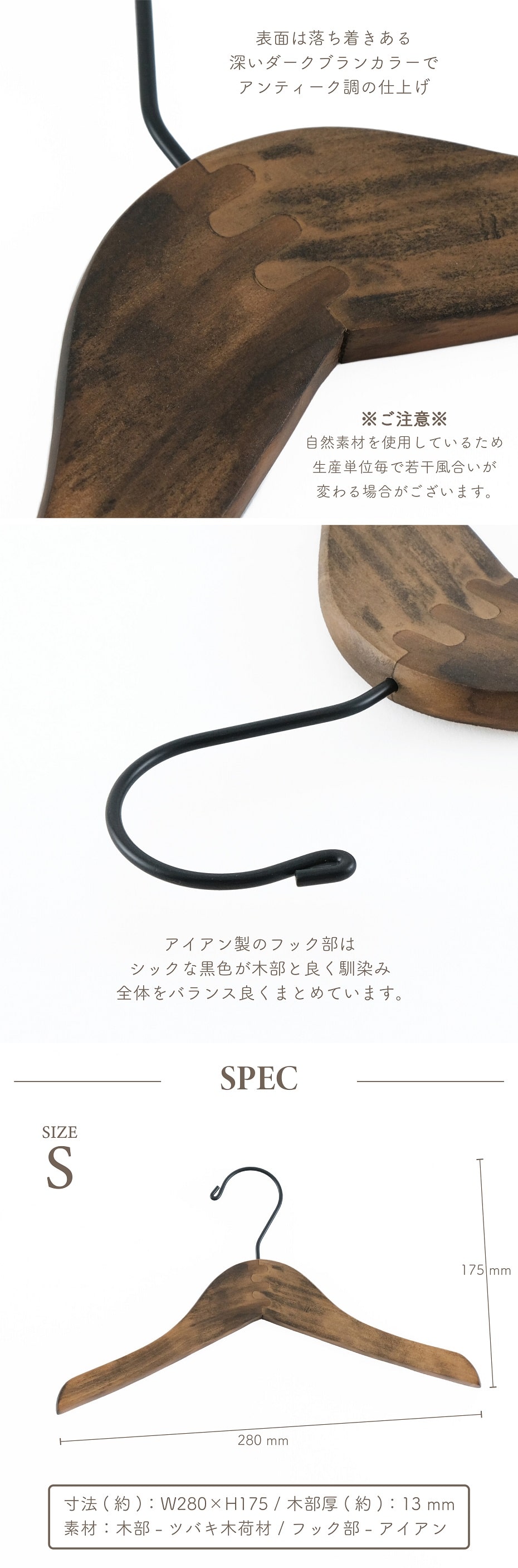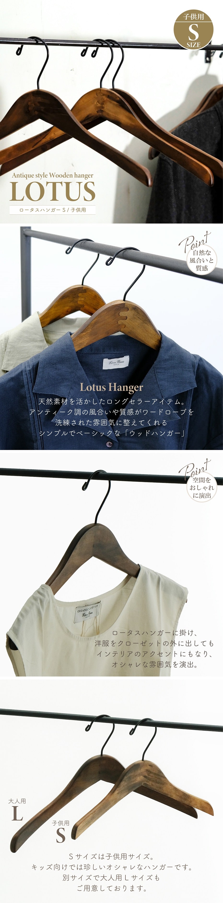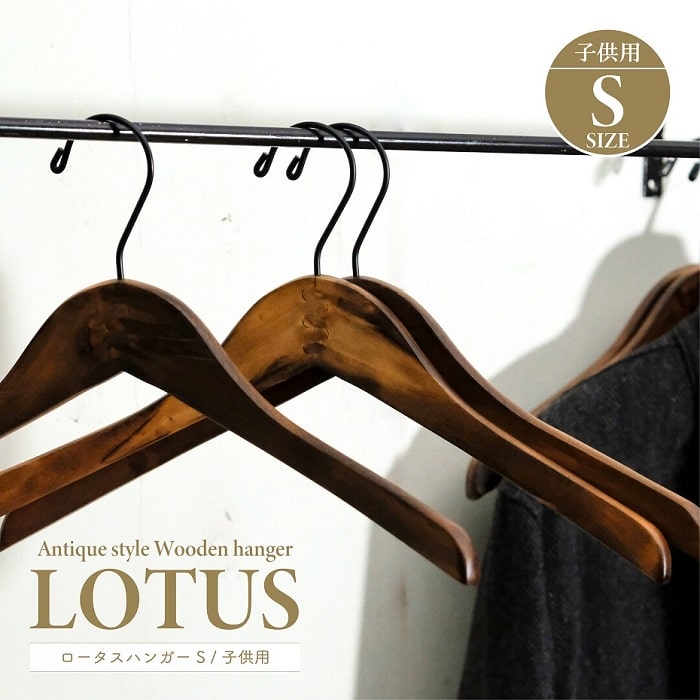 収納用品 shesay シセイ ロータスハンガー Sサイズ 子供用 キッズ用 木製ハンガー ダークブラン アンティーク調 アパレル ディスプレイ クローゼット インテリア
