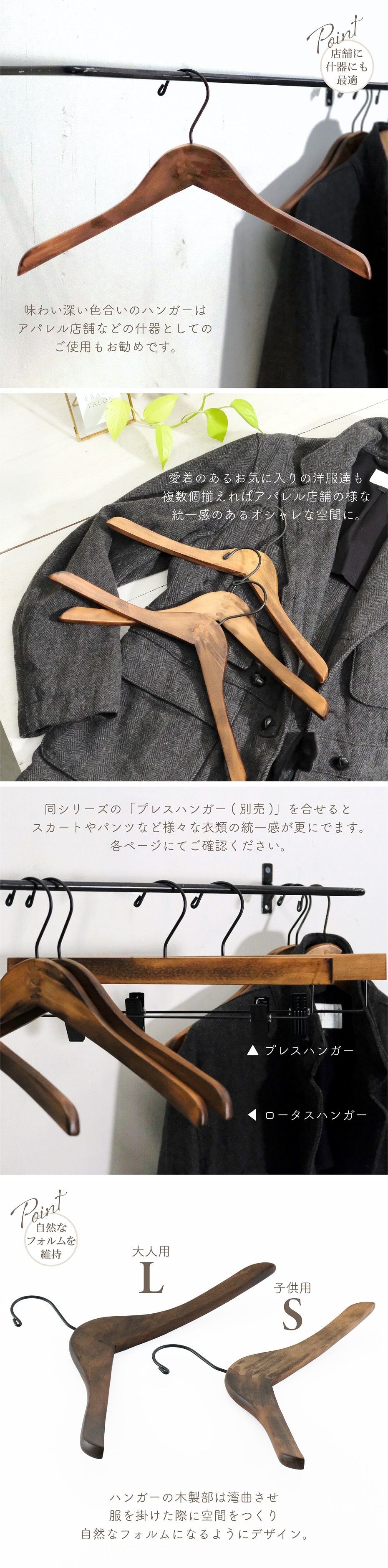 味わい深い色合いのハンガーはアパレル店舗などの什器としてのご使用もおすすめです。愛着あるお気に入りの洋服達も複数個使って揃えればアパレル店舗の様な統一感のあるオシャレ空間に。同シリーズのプレスハンガー(別売)を合せると、スカートやパンツなど様々な衣類の統一感が更にでます。