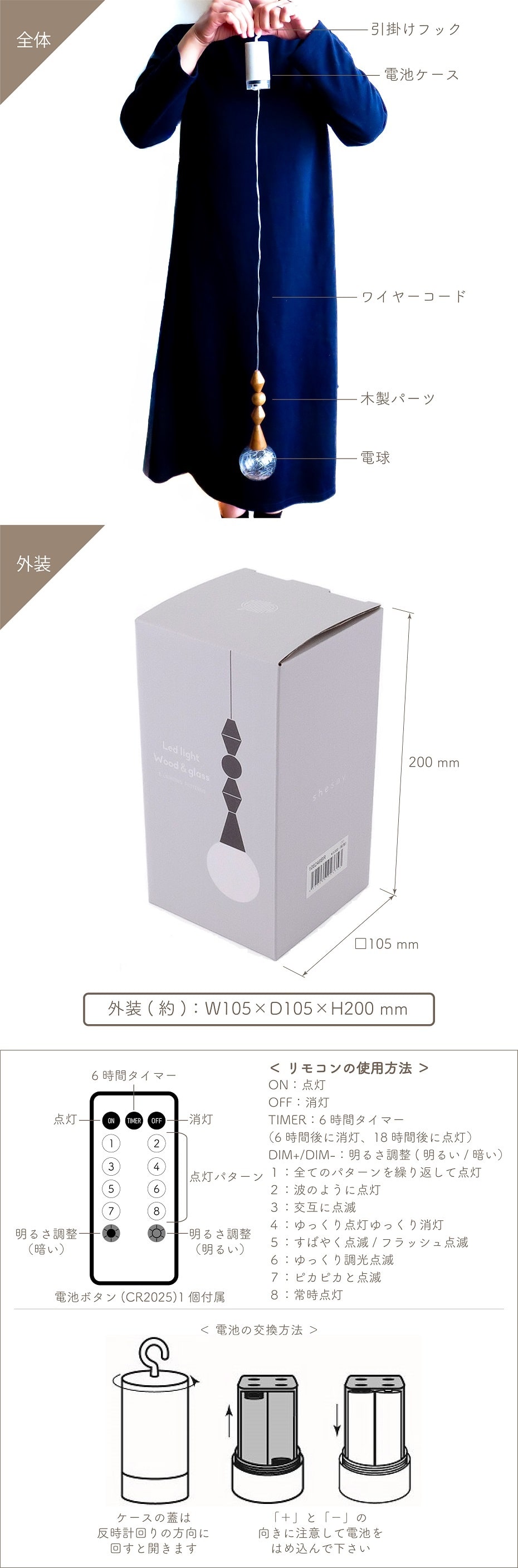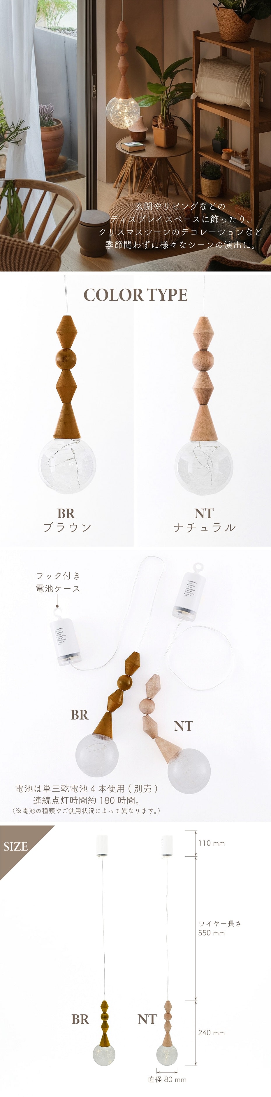 オークウッドを使用した木製パーツは「ナチュラル」と「ブラウン」の2色。優しい木目で穏やかな印象をもちインテリアに馴染み空間を演出。フック付きの電池ケース、電池式なので場所を選ばずお好みの場所に簡単に吊るすことが可能です。
