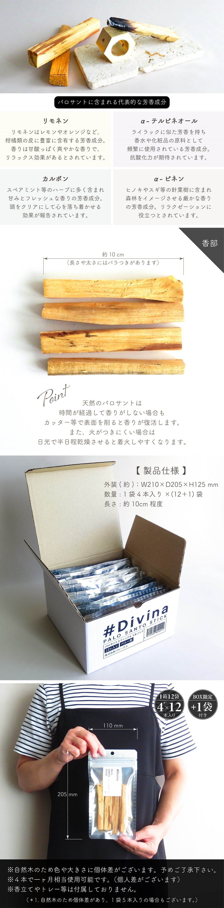 | 内 容 | 1箱12袋入り+1袋 計13袋 1袋:パロサント4本入り 計52本 (※香立てやトレー等は付属しておりません。) |