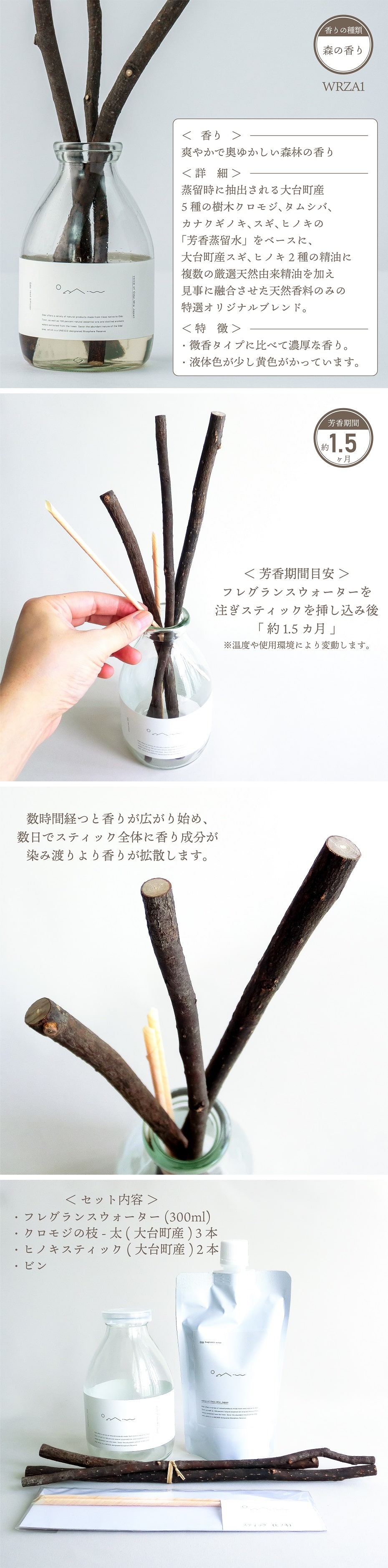 | 内 容 | フレグランスウォーター300ml,ビン 各1 クロモジの枝-太 3本,ヒノキスティック 2本 |