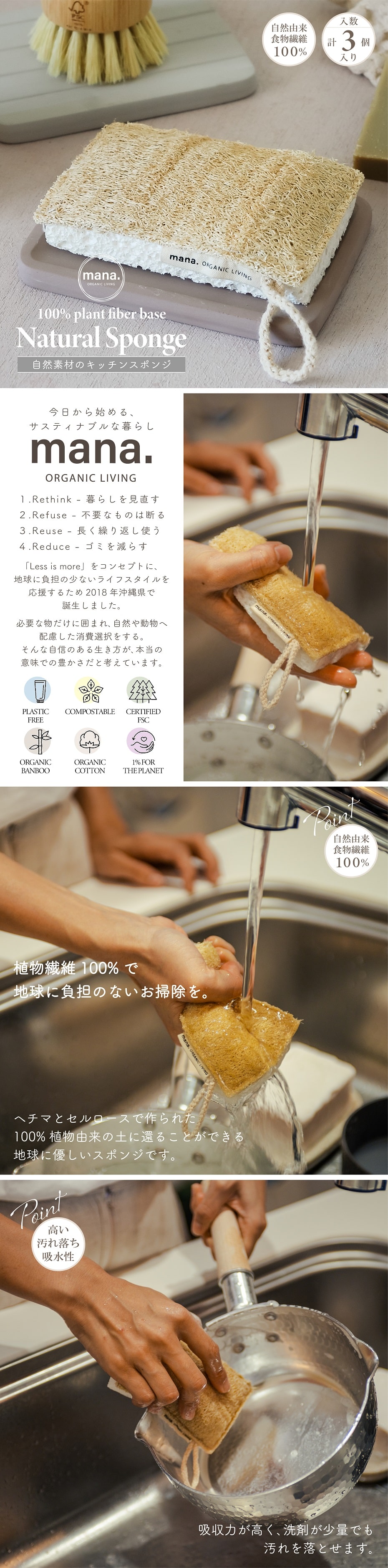 ■ mana. 自然素材のキッチンスポンジ 3個入り ■