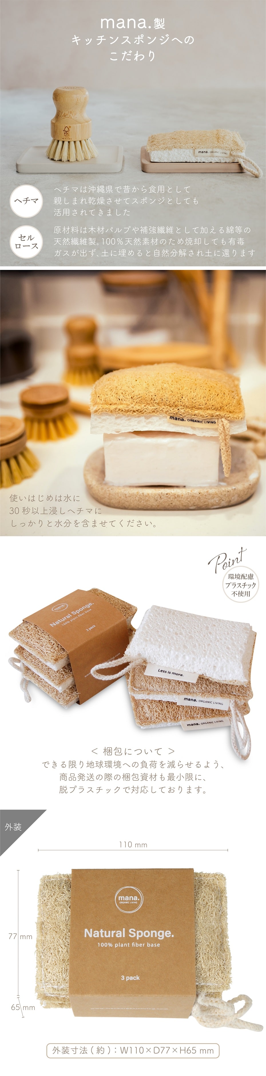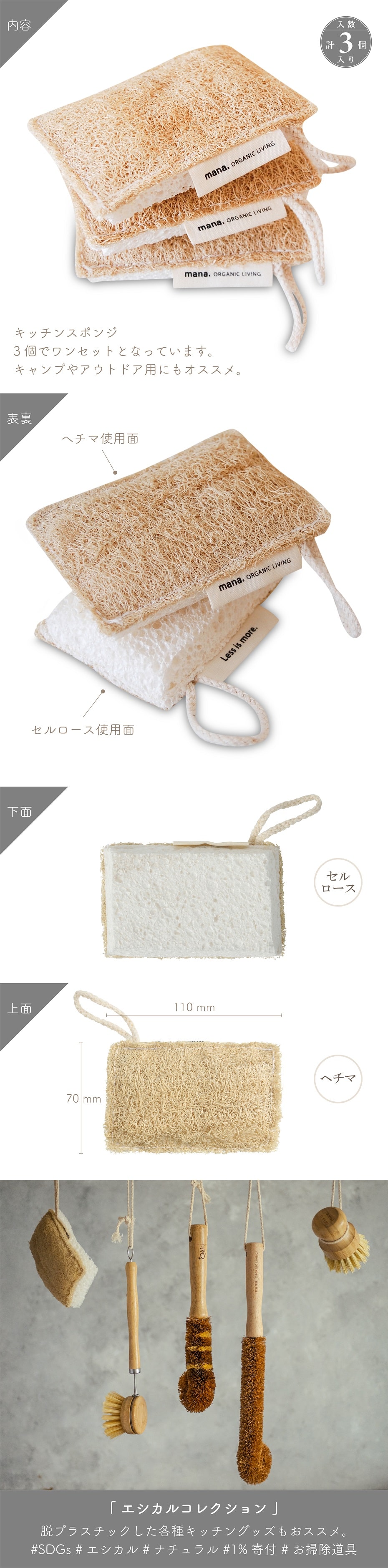 | 品 名 | mana. 自然素材のキッチンスポンジ 3個入り |