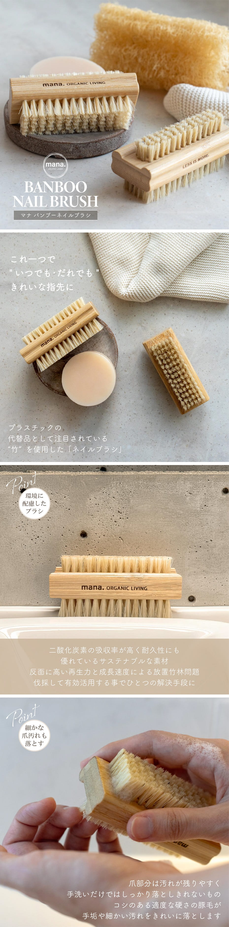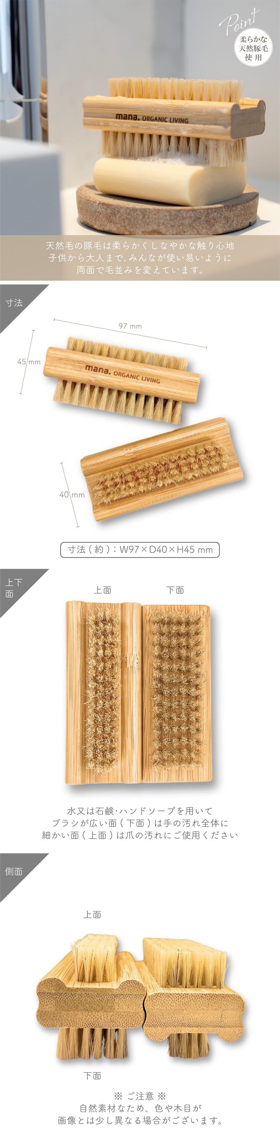 手洗い 爪ブラシ mana. バンブー ネイルブラシ 豚毛製 竹製 天然毛 自然素材 爪汚れ 子供 大人用 両用 ハンドケア ネイルケア エシカル サスティナブル おしゃれ