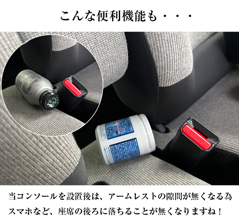メーカーオプションの収納付きアームレストコンソールには対応しておりませんのでご注意ください。