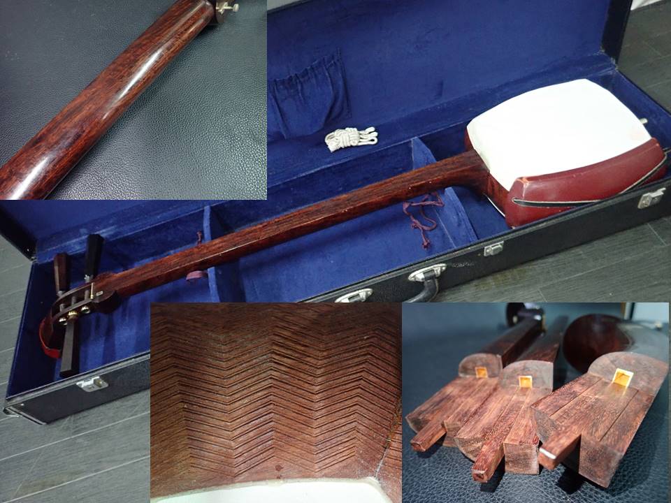 棹は紅木の太棹です。 繋は二本溝加工の金ホゾです。胴は最高級花梨材に子持ち綾杉彫りが施された最高級品です。糸巻きは黒檀・紅木(1本メンテあり)