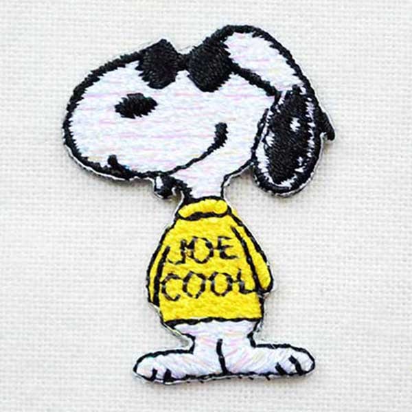 スヌーピー ジョークールのオフィシャル刺繍ワッペンです。キラキラ光るラメ糸を使った、目立つデザイン。