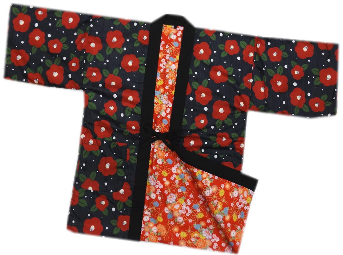 半天 袢纏 はんてん 女性用 和柄 リバーシブル 綿入 黒色地赤椿 M L