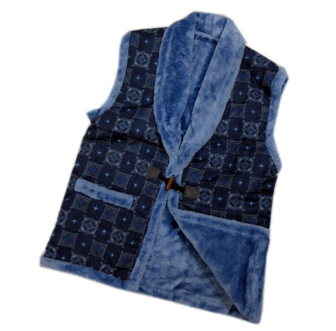 ぽんちょ ポンチョ ベスト 背中&衿ボア付 メンズ 男性用 和柄 濃紺地菱華四角 M-L 中綿入 袖なし 半天 はんてん