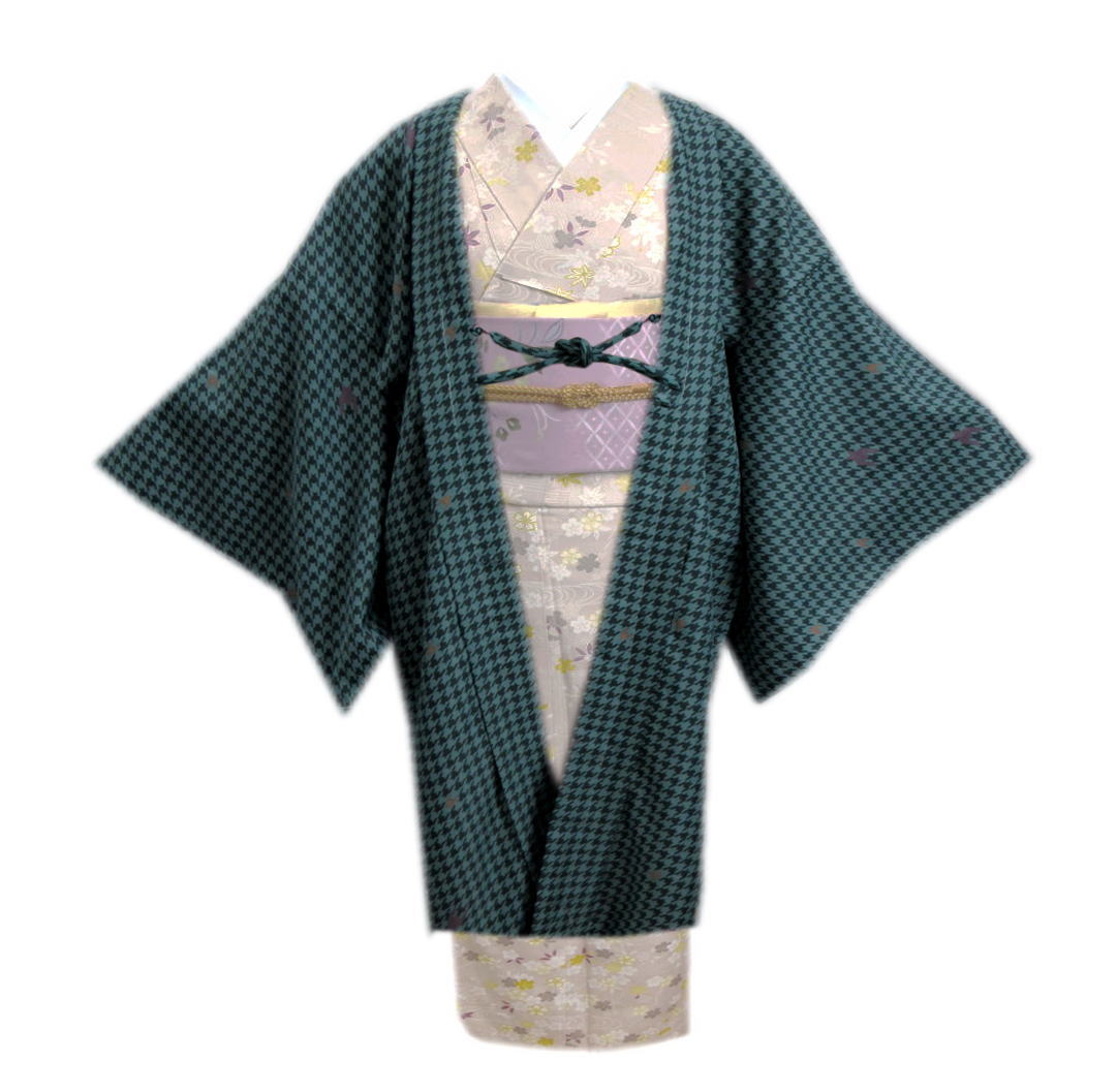 長羽織 はおり コート 洗える 濃緑グレー地千鳥格子 M L 羽織紐付 ロング丈 和装 着物 女性用 冬用 春 秋