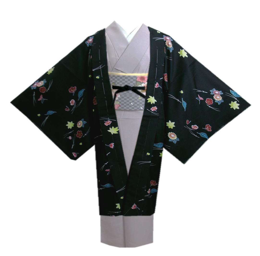 長羽織 はおり コート 洗える 黒地桜楓野菊松葉 フリー 羽織紐付 ロング丈 単品 和装 着物 女性用 黒色