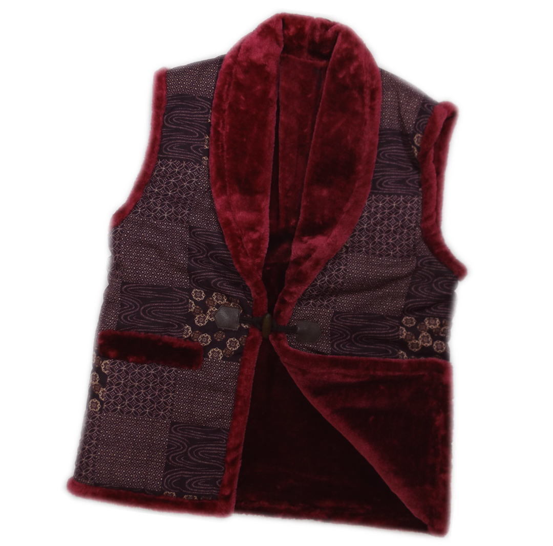 ぽんちょ ポンチョ 袖なし 半天 ベスト 女性用 背中&衿ボア付 和柄 中綿入 濃紫地古典柄絣調市松 M-L