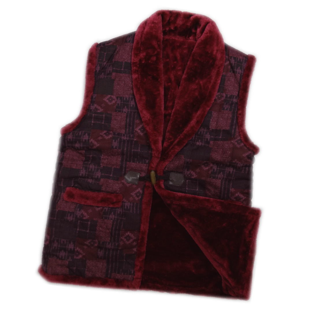 ぽんちょ ポンチョ 袖なし 半天 ベスト 女性用 背中&衿ボア付 和柄 中綿入 濃紫地絣調古典色紙 M-L