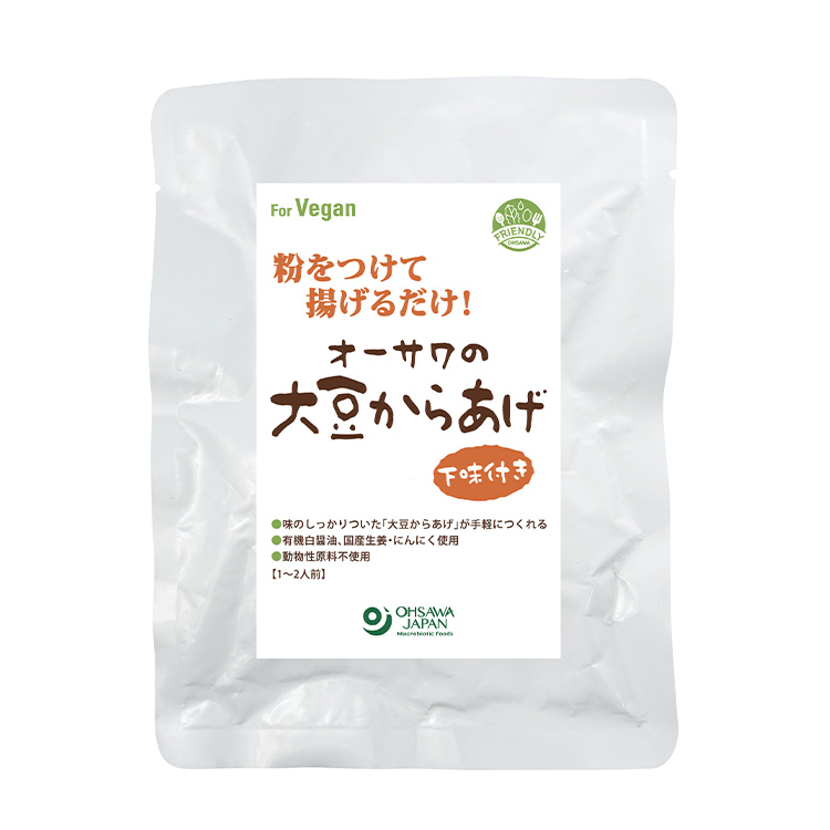 人気商品「オーサワの玄米粉入り大豆からあげ」を有機白醤油、国産生姜・にんにく等のオリジナル調味液に漬け込んだ、下味付き大豆からあげが新発売!