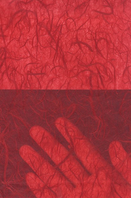 着色した楮(こうぞ)の長い繊維を混ぜて漉きました。
