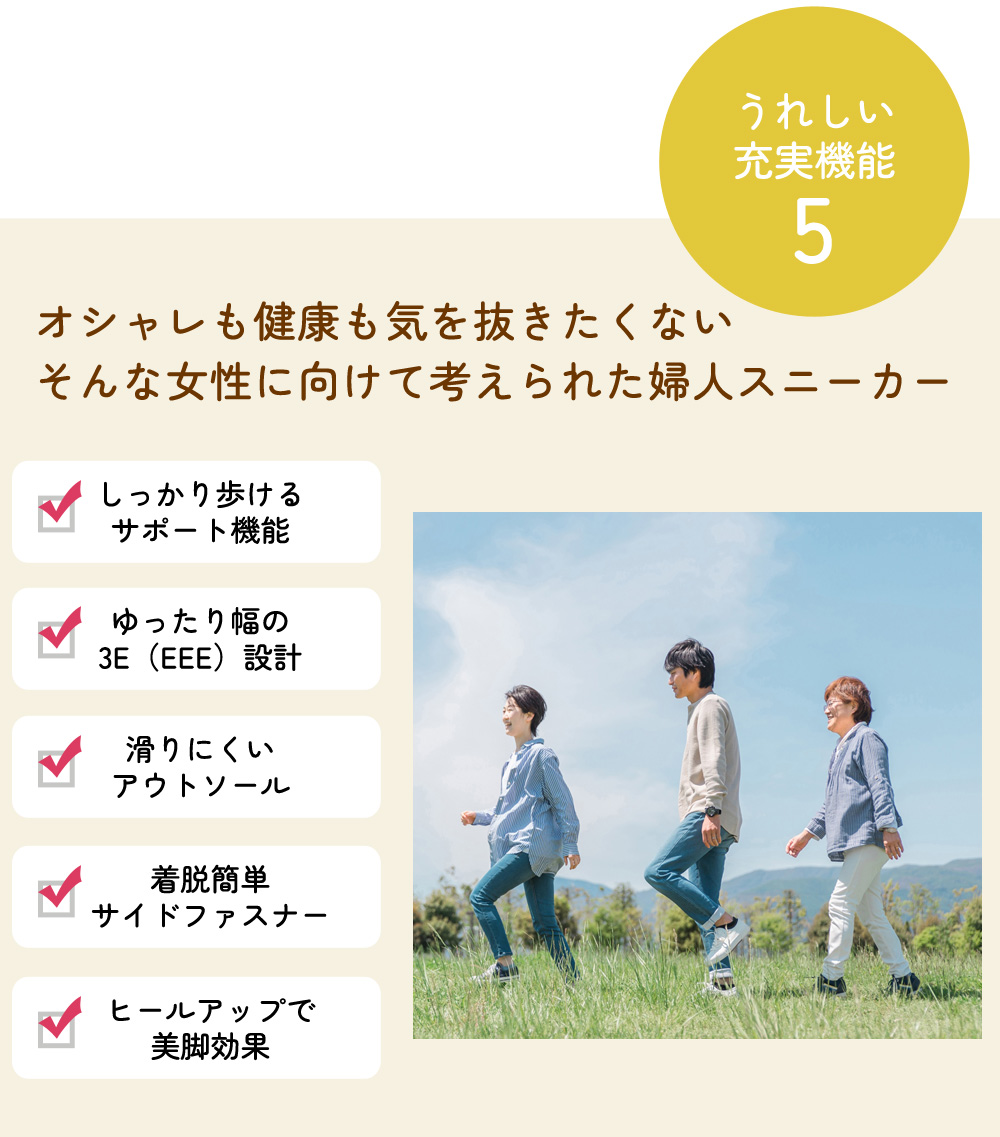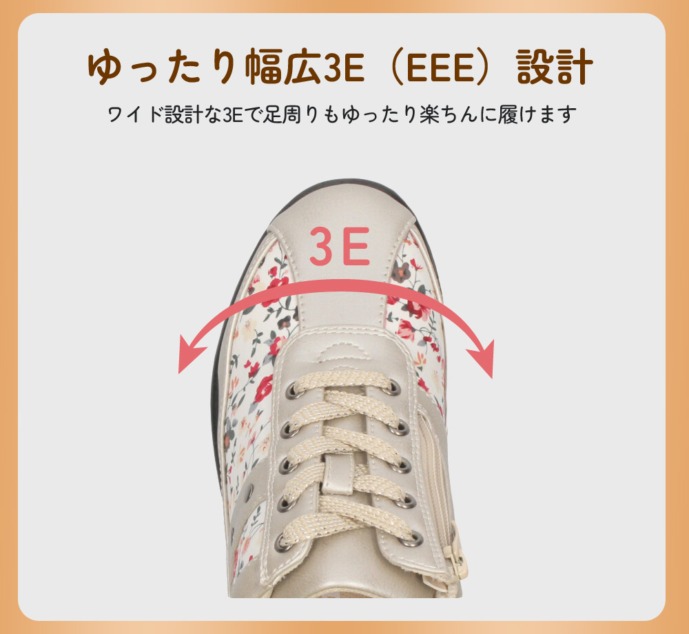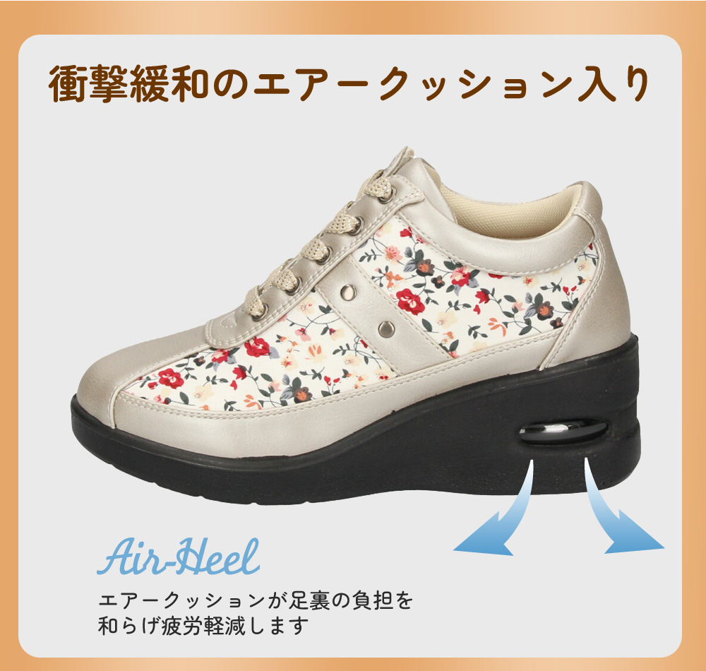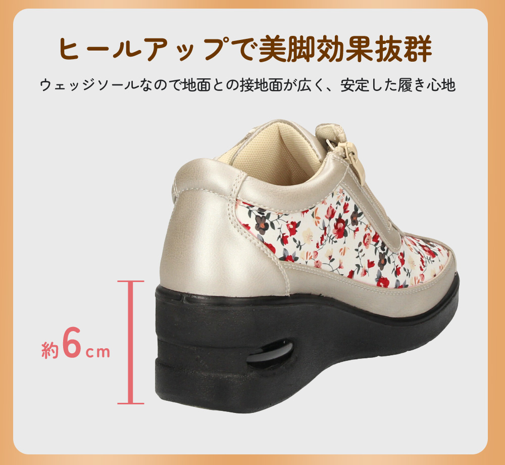 | 商品説明 | スタイルアップも叶えるヒールデザインが自慢のコンフォートシューズ。 コンフォートスニーカーには珍しい約6cmと高めのウエッジヒールで美脚・脚長効果が期待できます。ウエッジソールなので地面との接地面も広く、さらに約2cmのストーム(前底)付きなので安定した履き心地が実現できます。滑りにくい防滑ソールも採用しているので安心して歩行できます。ヒールにはエアークッションが入っており 足裏の負担を和らげ疲労を軽減します。また内ファスナー付きで着脱もスムーズに行えます。スタイリッシュな見た目でおしゃれしてお出掛けする際にもおすすめです♪母の日・敬老の日・お誕生日のプレゼントにも喜ばれます! |
