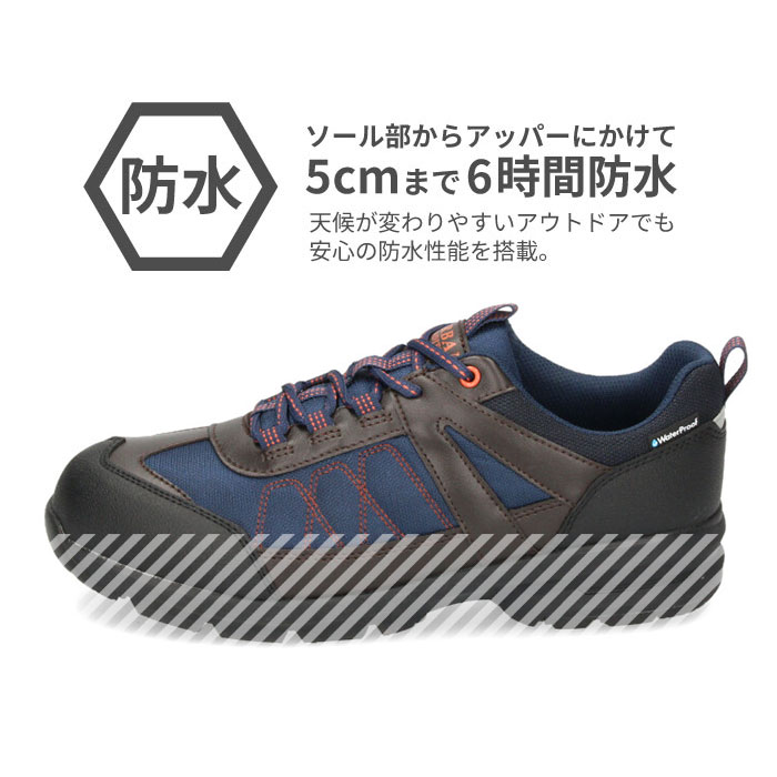 軽くてクッション性があり、屈曲性のよい靴底設計です。ソールからアッパーにかけて5cmまで6時間防水設計です。取り外しが可能なカップインソール。夜間歩行時の安全性を高める反射材付きです。デイリーな街履きはもちろん、アウトドアでも活用できます。