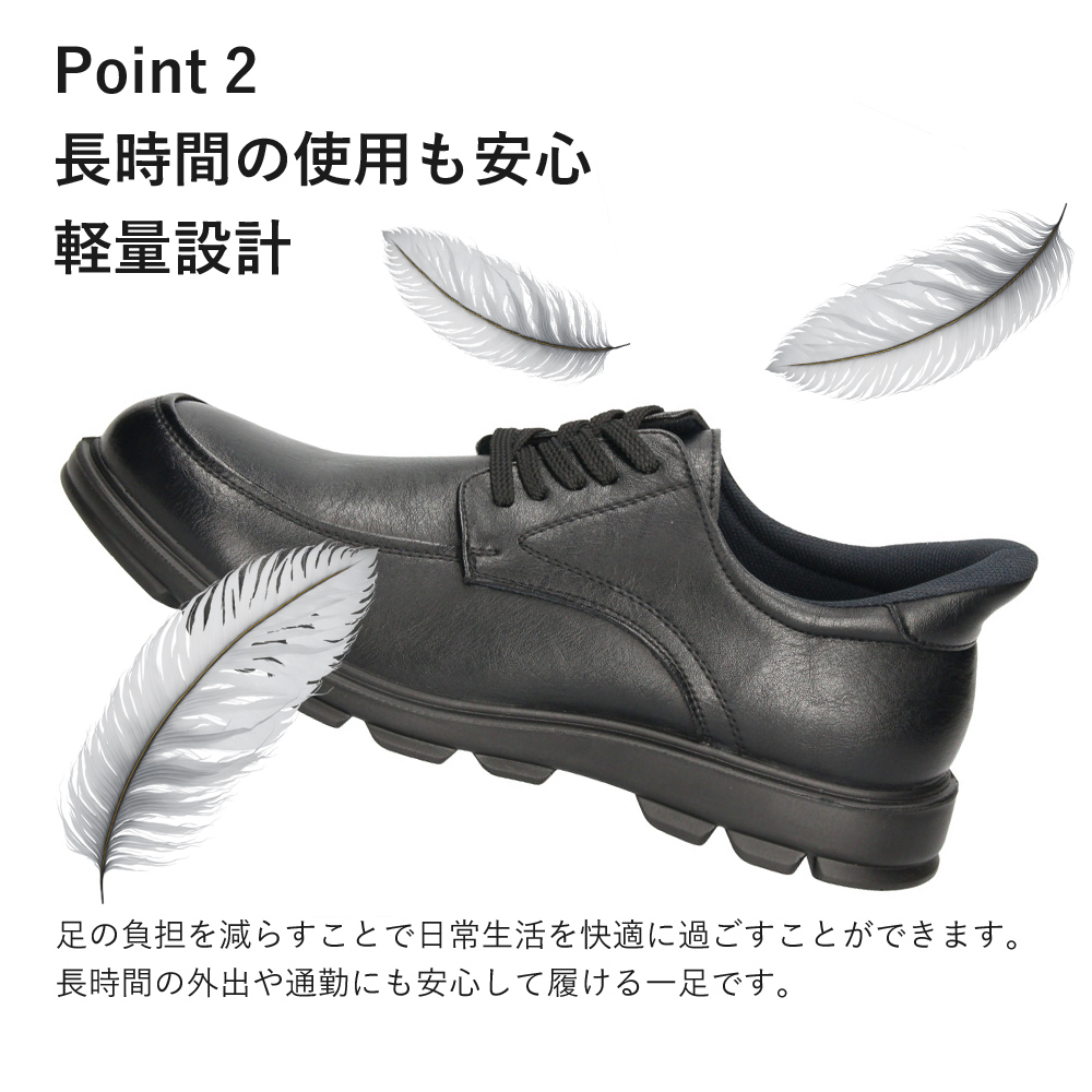 ハンズフリーで脱ぎ履き快適。実用性に優れた本革シューズ。 本革の上質感とスニーカーのような軽やかさを兼ね備えたメンズシューズ。 特殊なかかと設計により、立ったまま足を滑らせるだけでスムーズな着脱が可能。両手がふさがっていても、屈まなくても脱ぎ履きできるハンズフリーデザインです。 軽量設計により足の負担を軽減し、長時間の外出や通勤も快適。接地面から4cm×4時間の防水設計で、雨の日も安心です。 足にしなやかにフィットするストレッチ牛革を使用し、屈曲性のある構造で自然な足運びをサポート。さらに耐摩耗性に優れたアウトソールが靴底のすり減りを抑え、高い耐久性を発揮します。 毎日を快適に彩る、実用性に優れた一足です。
