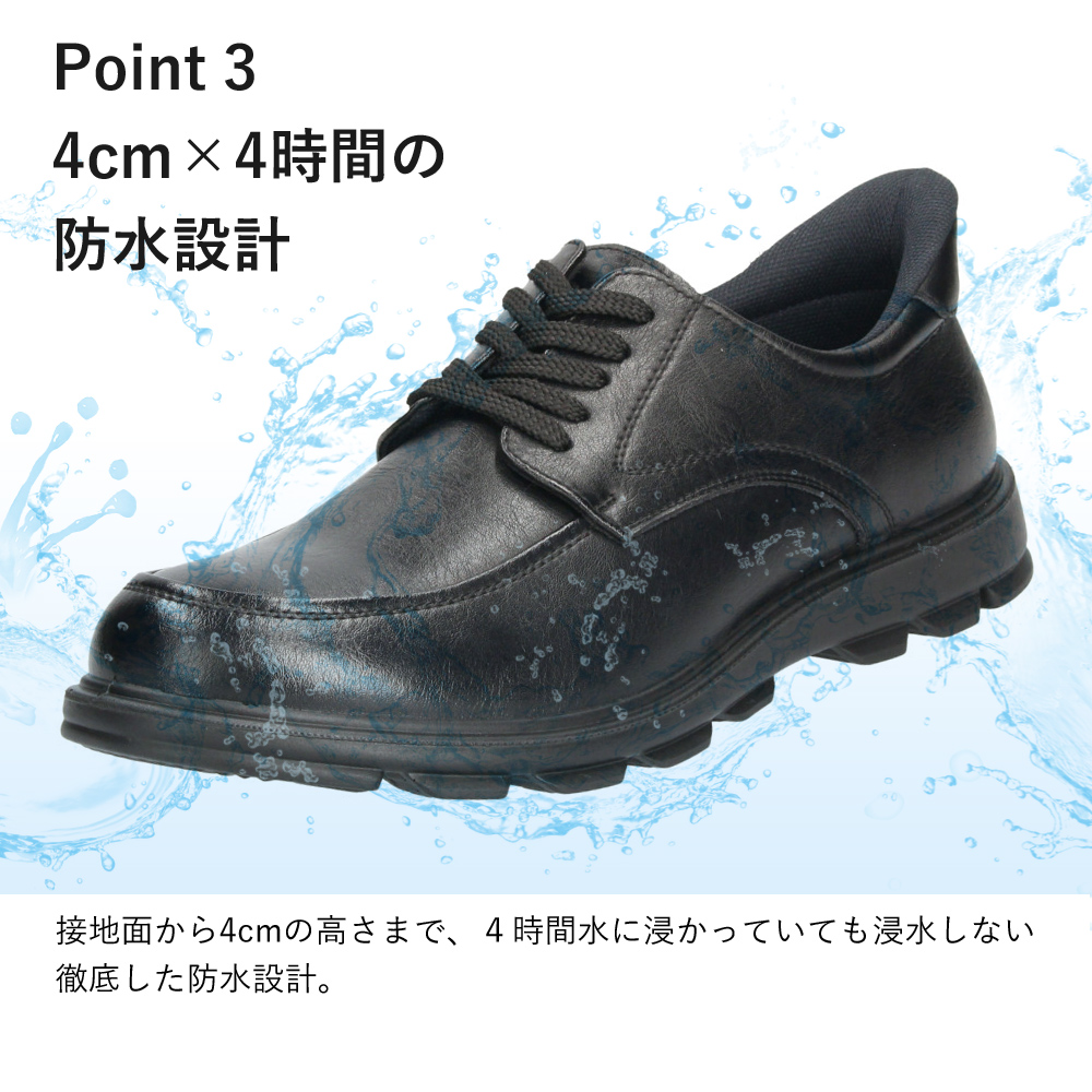 軽量設計により足の負担を軽減し、長時間の外出や通勤も快適。接地面から4cm×4時間の防水設計で、雨の日も安心です。
