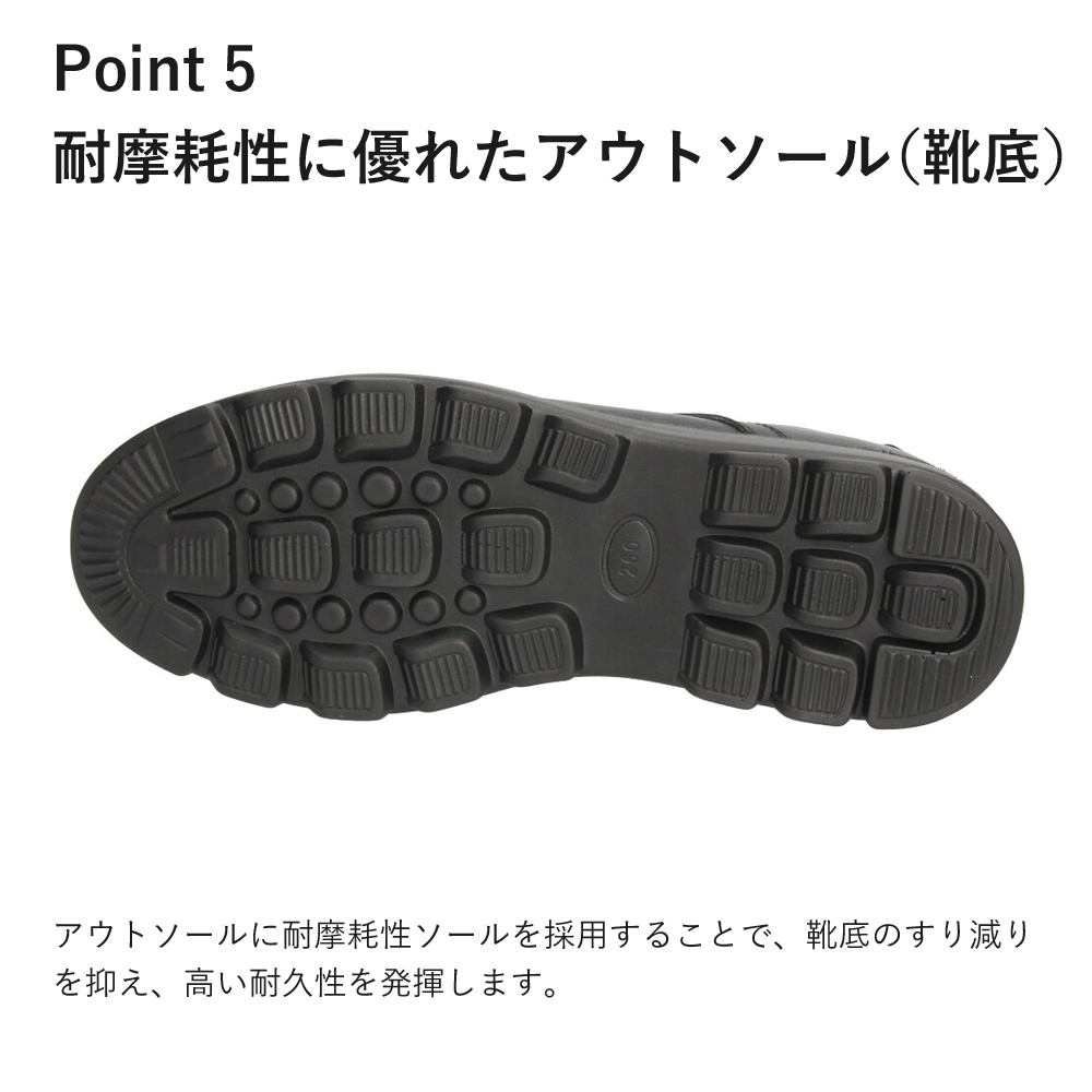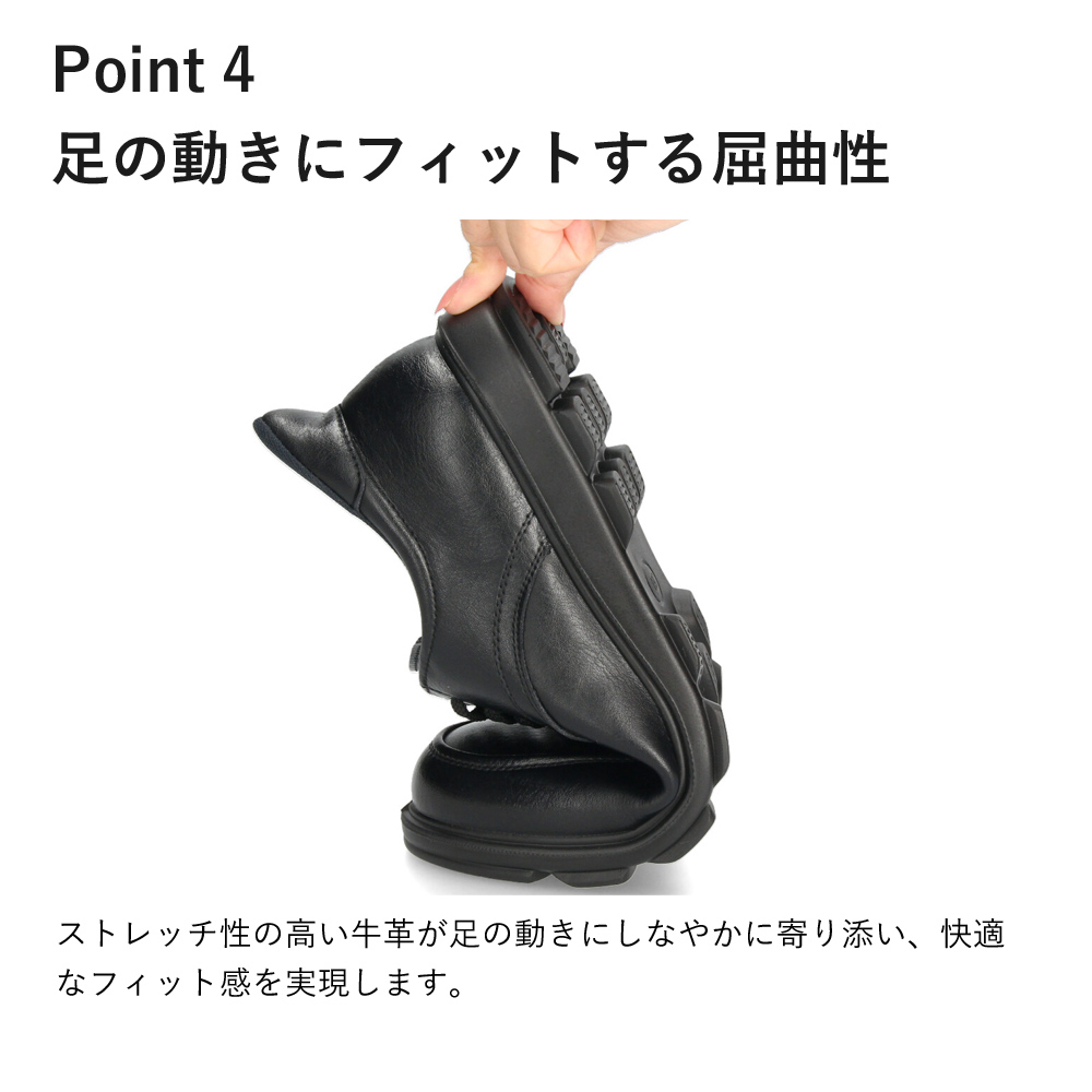 足にしなやかにフィットするストレッチ牛革を使用し、屈曲性のある構造で自然な足運びをサポート。さらに耐摩耗性に優れたアウトソールが靴底のすり減りを抑え、高い耐久性を発揮します。