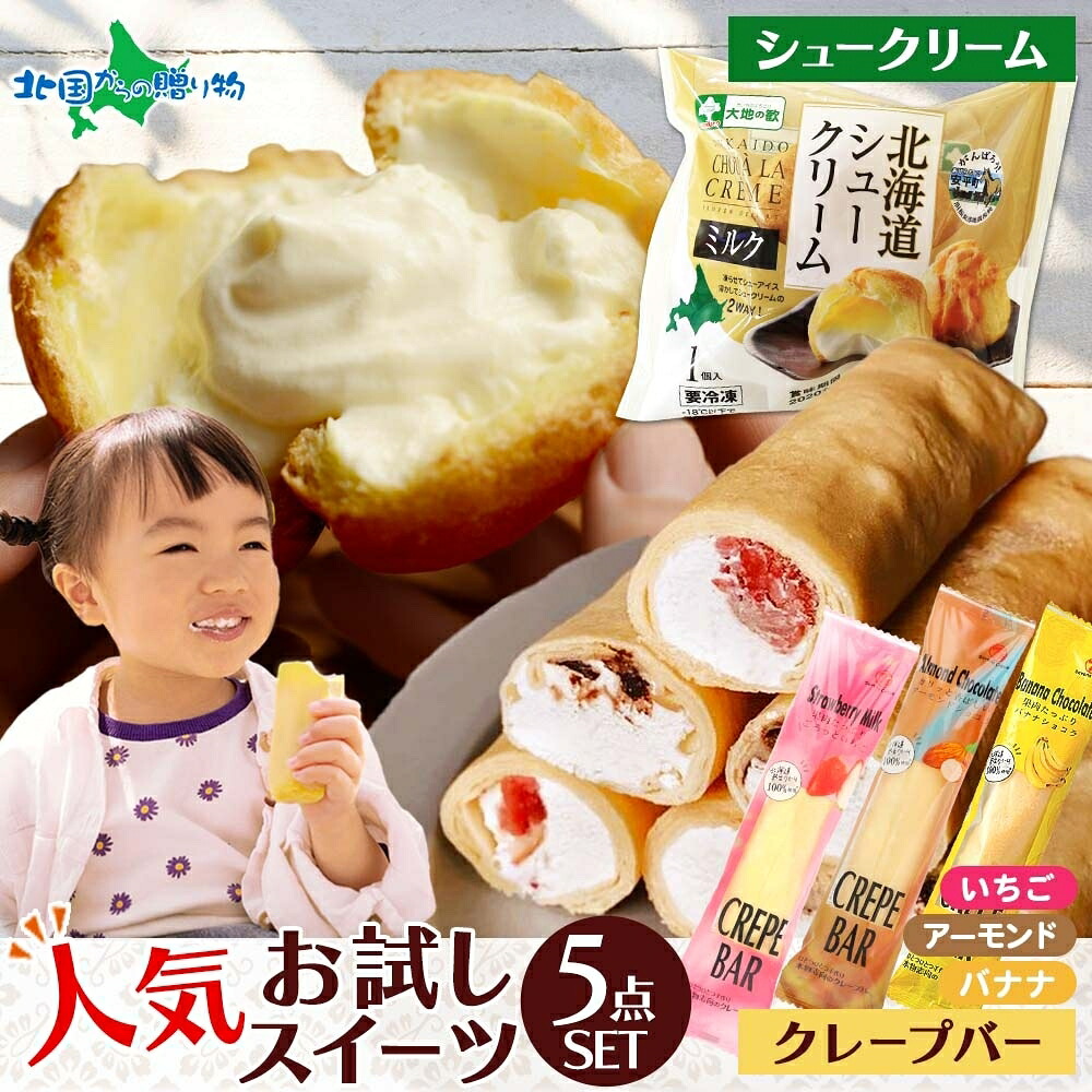 | 商品内容 | 北海道シュークリーム 2個入 クレープバー(ごろっといちご) 1個入 クレープバー(バナナショコラ) 1個入 クレープバー(アーモンドショコラ) 1個入 |