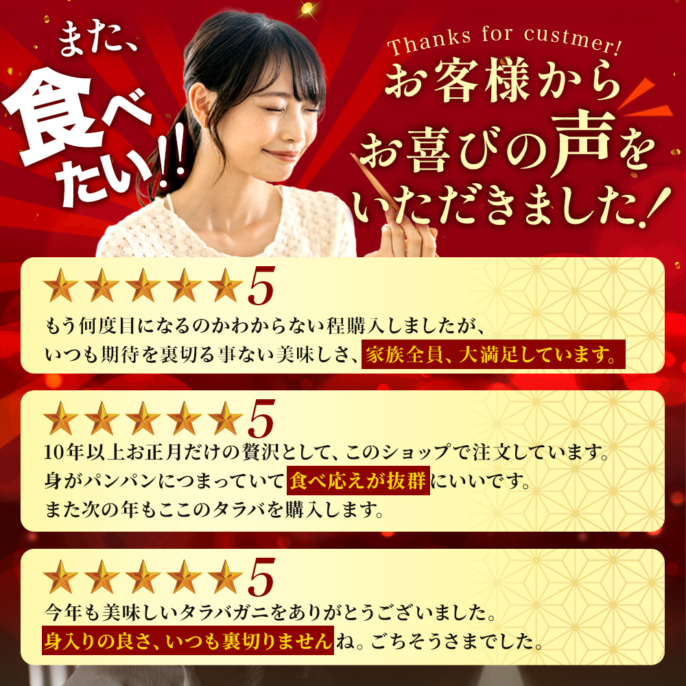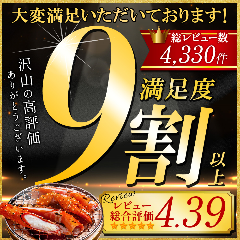 | 商品内容 | ボイル冷凍 タラバガニ足 1kg前後(1-2肩3-6本) ※訳あり業務用のため、本数の指定不可 |