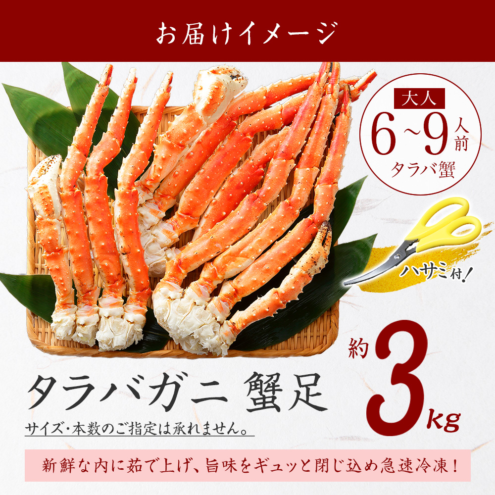 | 商品内容 | ボイル冷凍 タラバガニ足 3kg前後(3-6肩9-18本) ※訳あり業務用のため、本数の指定不可 |