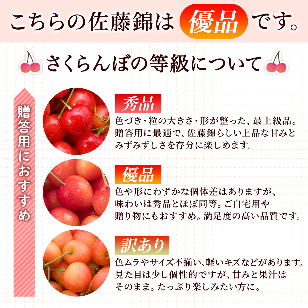 | 商品内容 | 山形県産さくらんぼ 佐藤錦 優品 L玉 600g前後 2L・L混合あり |