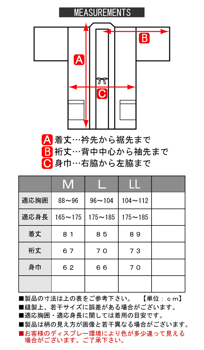 M ・ L ・ LL (製品の寸法は表をご参考下さい)