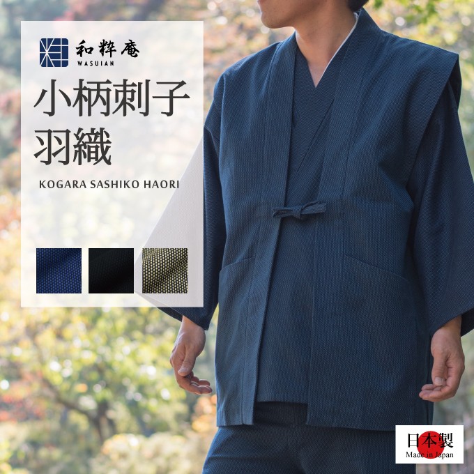 秋冬の定番人気商品「小柄ドビー刺子作務衣」と同じ生地を使用し、日本の職人が丁寧に仕立て上げました。規則正しく並ぶ刺子柄が印象的な表地に、ポリエステルの裏地を付けて、サッと気軽に着やすい仕様に仕上げています。両サイドには、使い勝手の良い深めのポケット付き。作務衣の上から羽織るだけで、一段と格調高い装いが完成します。同じ生地の作務衣とあわせたり、他の生地の作務衣とあわせたり。素朴な刺子織の雰囲気を、是非コーディネートに取り入れてみてください。