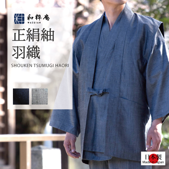 作務衣用として独自に織った絹100%の紬生地を使用し、日本の職人が丁寧な縫製で丹念に作り上げた最高級正絹羽織です。