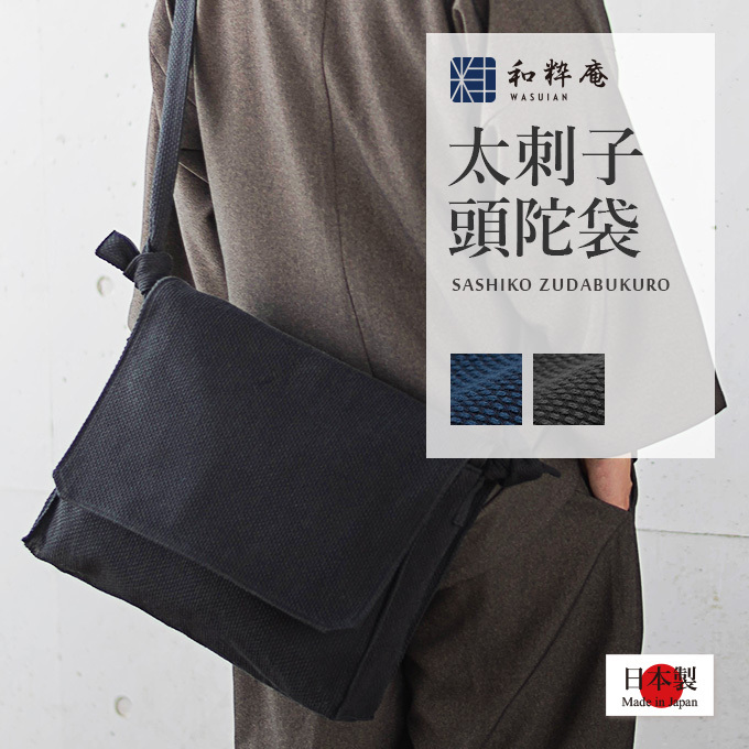 人気の太刺子作務衣と同じ生地を使用した、大判の頭陀袋です。B4サイズがゆったりと収まる横幅で、1〜2泊程度の荷物をまとめて入れることが出来ます。肩紐と本体が分離した形で、紐の長さの調節も自由自在です。作務衣でのお出かけや、普段使いにも便利なバッグ。和装に関心のある方へ、贈り物にもどうぞ。