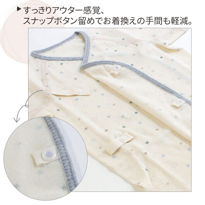 赤ちゃんに気持ちよく胸元はすっきりとスナップボタン留め。