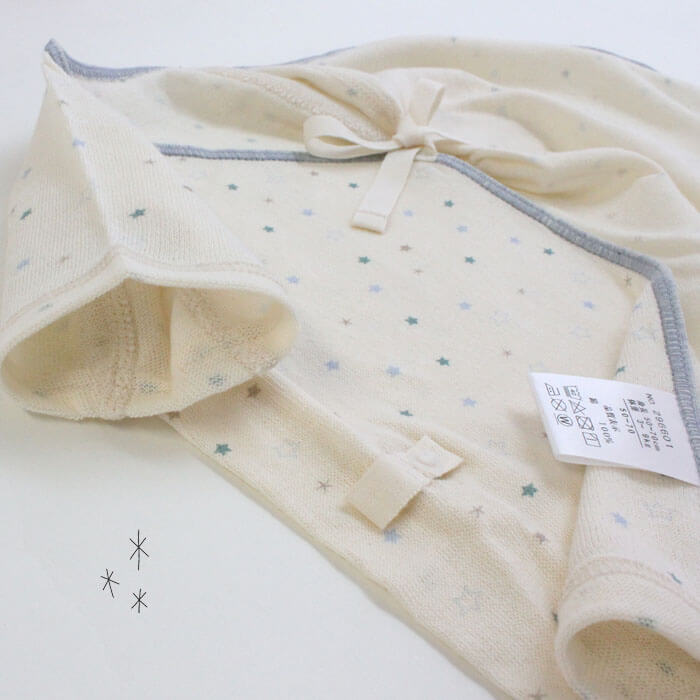 | その他 | 赤ちゃんのために厳選されたやわらかい生地を採用しております。 オーガニックコットンを使用した日本製の中肌着。 アウター感覚を取り入れたデザインで、暑いときはこれ1枚でもOK。 たくさんの小さな星をちりばめた柄と淡い色合いが、シックでかわいい印象です。