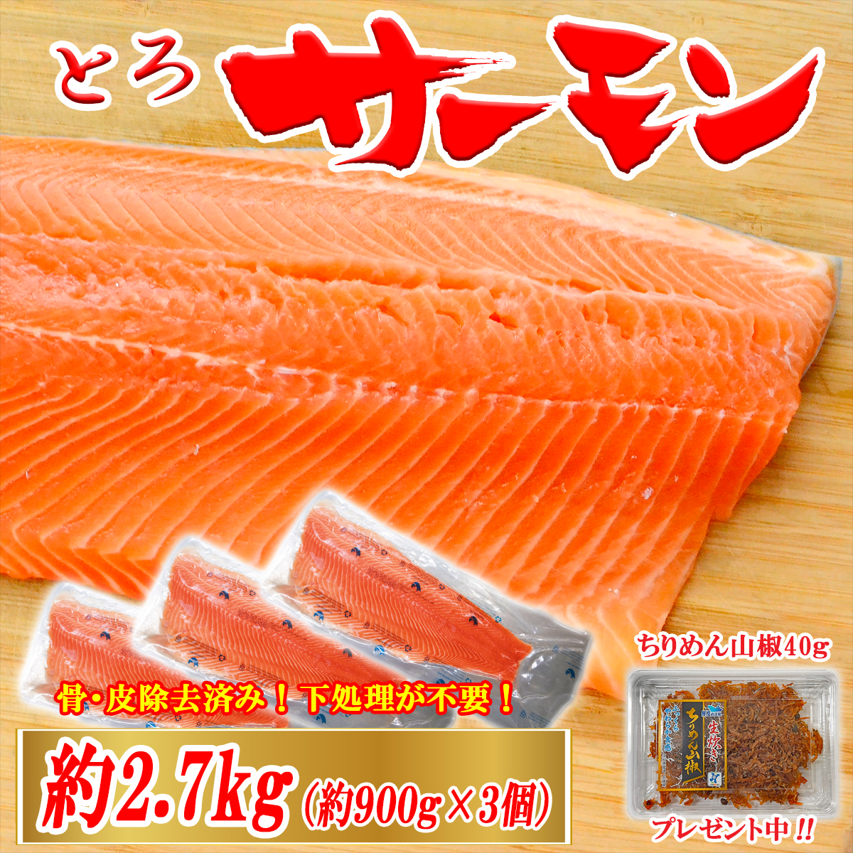 送料無料 サーモン 刺身 とろサーモン 鮭 約2.7kg 3個セット 大容量 お徳用 業務用 お歳暮 ギフト 贈答用 真空パック 骨なし皮なし 下処理不要