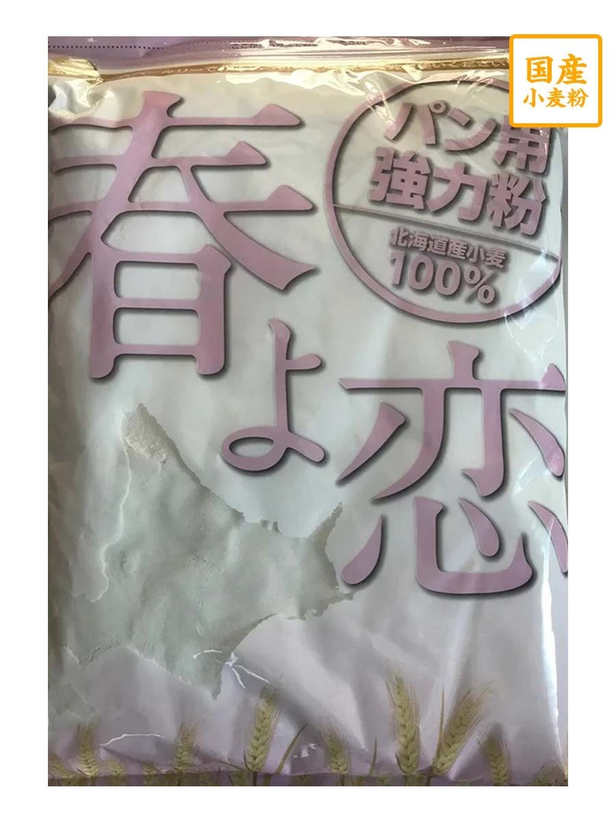 春よ恋100%使用。春よ恋は北海道で作られているパン用の春巻き小麦品種です。パン用国産小麦として有名な「ハルユタカ」の後継品種であり高い製パン適性を誇り、蛋白量や吸水性・窯伸びや風味もよくしっとりとソフトでもっちもちの食感が特徴です。食パンはもちろん菓子パンやデニッシュ、クロワッサンなど幅広くご使用いただけます。
