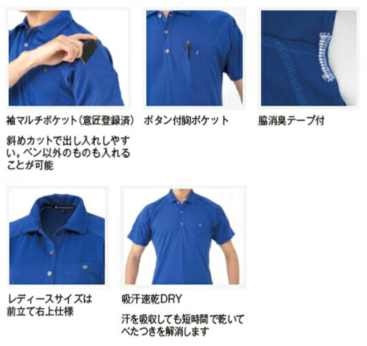 | 特徴・ポイント | ・Xライン&スポーツシルエット ・袖マルチポケット ・ボタン付胸ポケット ・脇消臭テープ付 ・レディースサイズは前立右上仕様 ・吸汗速乾DRY |
