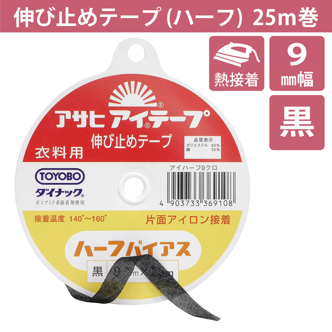 伸び止めテープ アサヒアイテープ ハーフバイアス 9mm 25m 黒 中厚手 厚手 アイロン 熱接着 接着芯 織物 保形 補強 洋裁 バイヤス