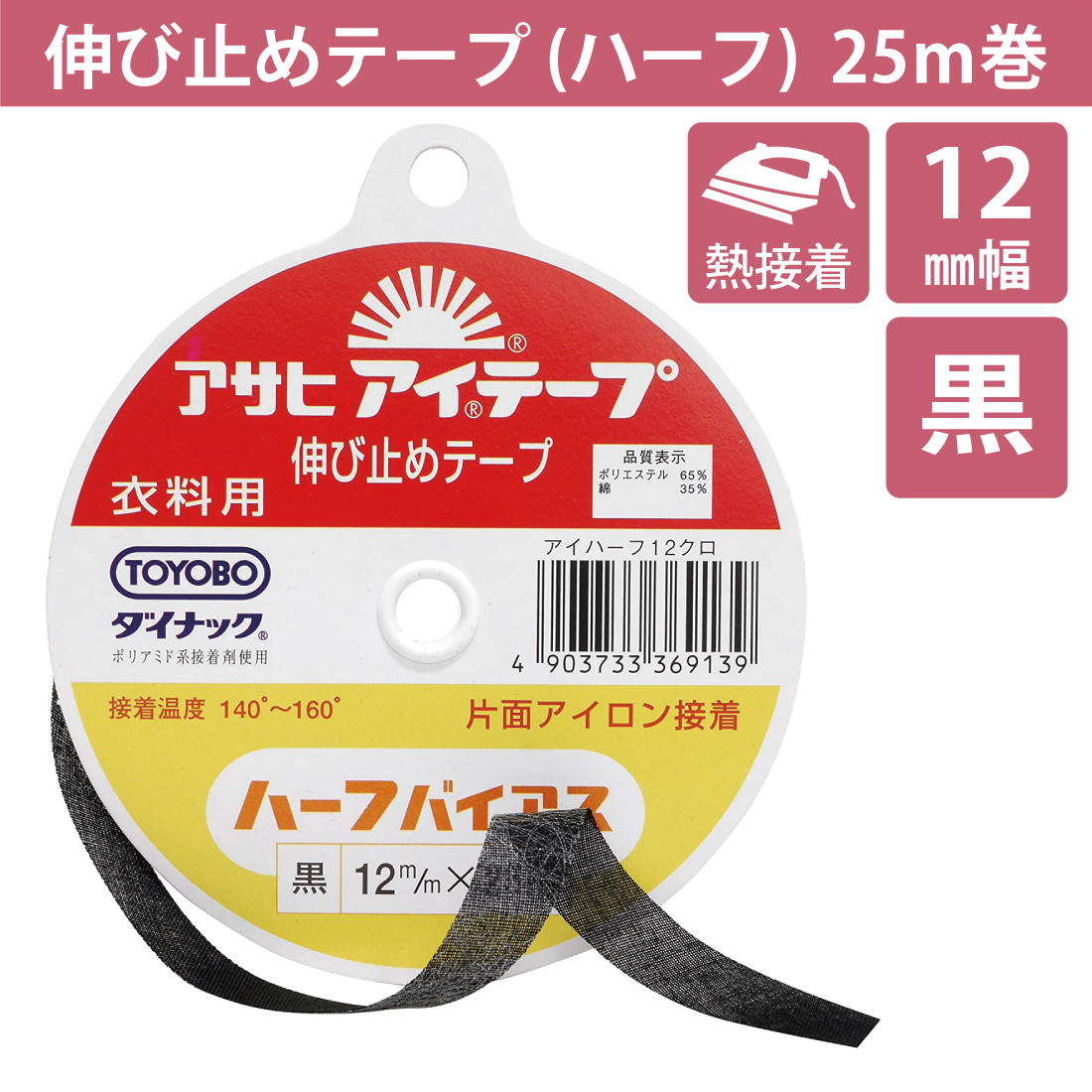 伸び止めテープ アサヒアイテープ ハーフバイアス 12mm 25m 黒 中厚手 厚手 アイロン 熱接着 接着芯 織物 保形 補強 洋裁 バイヤス